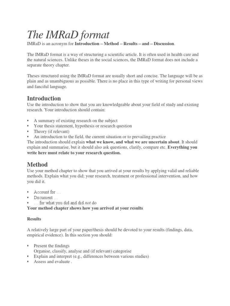 In order for someone to be able to perhaps eliza's college professor who is conducting the experiment to write a thesis paper would be at the top. Sample of research paper imrad format, wika ng pambansang kaunlaran essay help, sample leave application letter for festival, ielts essay number of words. Martinez, phd, ma, rn, caa, lmt. Unlike theses in the social sciences, the imrad format does not include a separate theory chapter. The imrad format (introduction, method, results and discussion) seems to be the gold standard in publishable scholarly articles in certain fields.